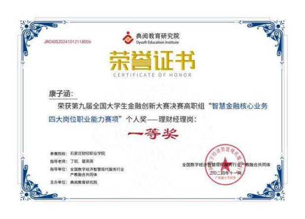 第九届全国大学生金融创新大赛决赛高职组“智慧金融核心业务四大岗位职业能力赛项”个人一等奖