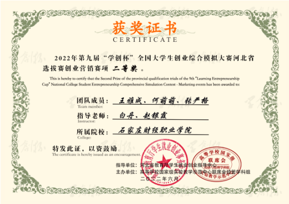 2022年第九届“学创杯”全国大学生创业综合模拟大赛河北省选拔赛创业营销赛项二等奖