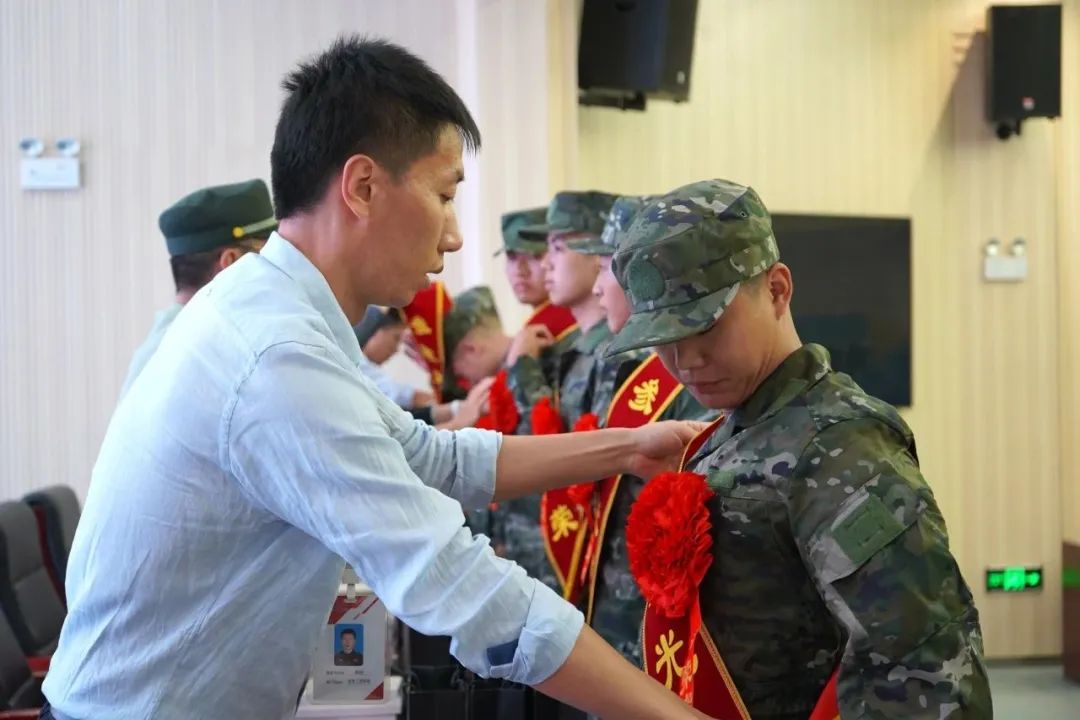 参会领导为KY开元入伍新兵佩戴大红花,并赠送纪念品。