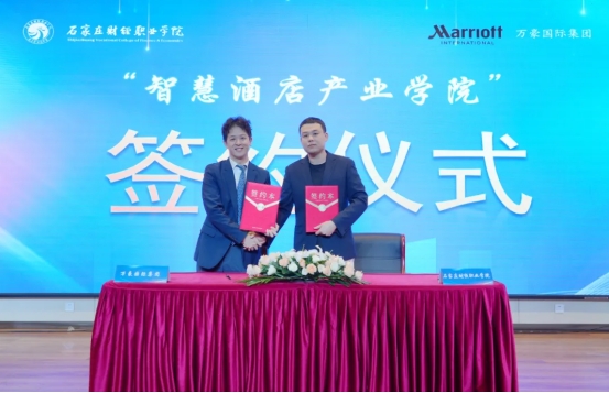 万豪国际集团大中华区校企关系高级经理朱程先生、学校副校长李同鑫,共同签署了“智慧酒店产业学院”合作协议;这份协议不仅仅是一份文件,更是双方共同的承诺和责任。它标志着双方将携手共进,为培养高素质的酒店人才而努力奋斗。