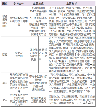 美国、德国、英国和澳大利亚等国家,在职业教育质量评估方面根据本国教育评价的现实需求设定不同维度的评价指标。美国评估体系突出“三个本位”:技能本位、学生本位和社会本位。英国以督导式评估为核心,实施Ofsted主导下的职业教育质量督导评估。德国融合了以人为本的教育理念和多维度的分析框架,教学质量评估框架居于核心地位,注重学校实践的有效性。澳大利亚借鉴联合国教科文组织关键指标,设定6个维度和53个指标。联合国教科文组织和欧盟在职业教育质量评估方面也有自己的独特之处。联合国教科文组织致力于促进世界职业教育发展,积极发展国际通用的指标体系和框架,借鉴普通教育指标体系,设定8个维度和54个指标。欧盟更加重视就业能力、供给匹配和参与机会3个维度,设定5个维度和73个指标。主要指标见表1。
