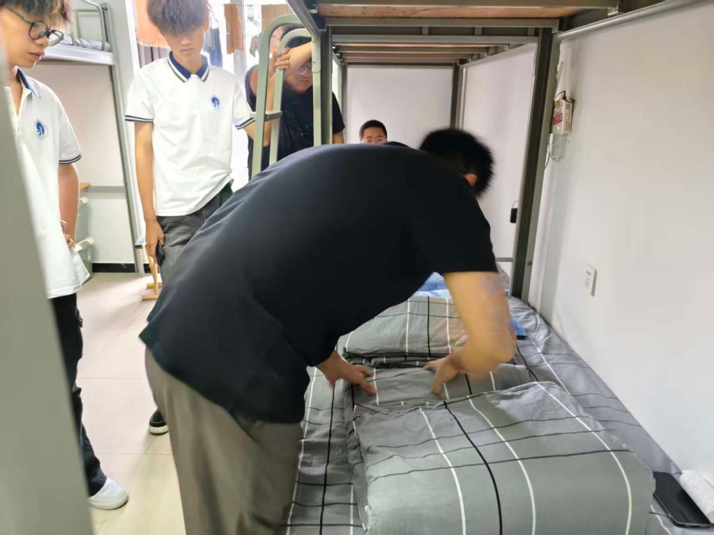 “叠被子看似简单,想要叠出方方正正的‘豆腐块’,可得讲究技巧。”在一间新生宿舍内,辅导员一边平铺被子,一边向围坐的新生讲解步骤,“先把被子压平,找到横向中线对折,再把两边向中间折,注意边角要对齐,最后慢慢调整棱角。” 为了让新生更好地掌握技巧,辅导员反复演示,还亲手拿着新生的被子,一步步带领操作。起初,不少新生叠出的被子要么形状松散,要么折痕歪斜,面对 “不听话”的被子有些手足无措。但在辅导员的耐心指导下,大家逐渐找到窍门,有的新生对照辅导员的示范视频反复练习,有的互相帮忙检查调整,宿舍里不时响起 “这里再捏一下棱角”“物品要分类放在物品箱里”的交流声。