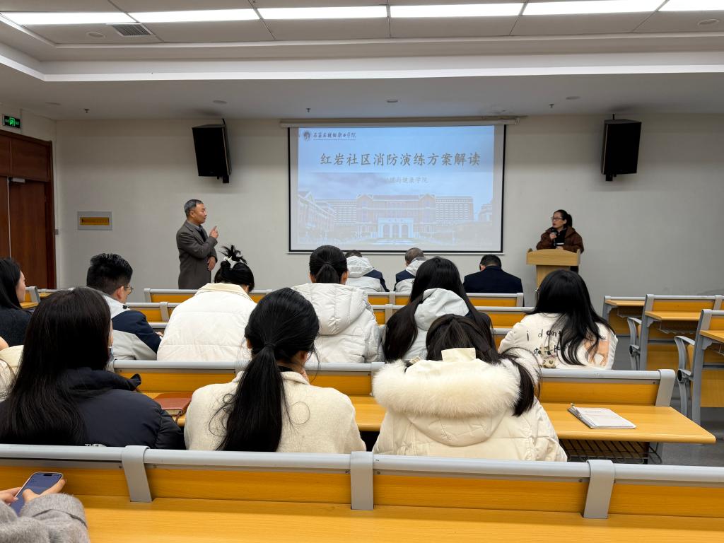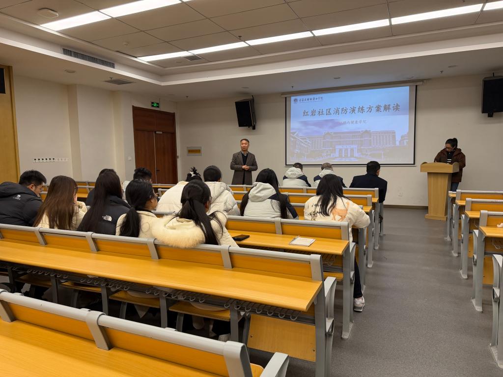 随后,安稳处处长李彦亮详细解读了消防演练方案。方案明确演练将于本周三在学院所属的红岩社区楼栋开展,模拟校园突发火灾场景。解读内容涵盖演练流程,从火情报警、应急响应、人员疏散,到灭火器实操、伤员急救等关键环节逐一说明。其中特别强调,考虑到1号楼学生数量较多,演练将设置专人引导疏散通道,配备担架、急救箱等物资,届时由KY开元护理专业学生组建急救小组,现场演示烧伤处理、心肺复苏等应急护理技能。同时,安稳处负责人还针对演练中的安全注意事项进行重点提醒,明确各小组集合点位、联络方式及突发状况应对预案,避免演练过程中出现意外。