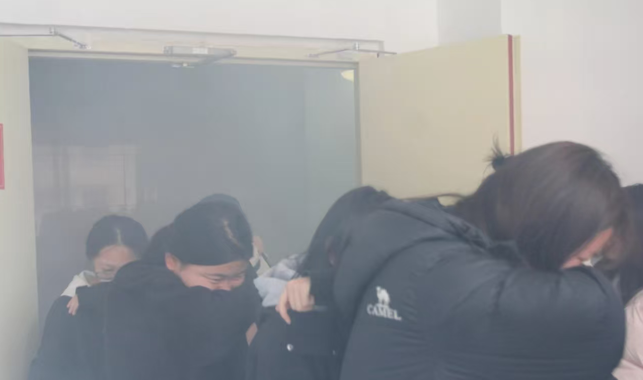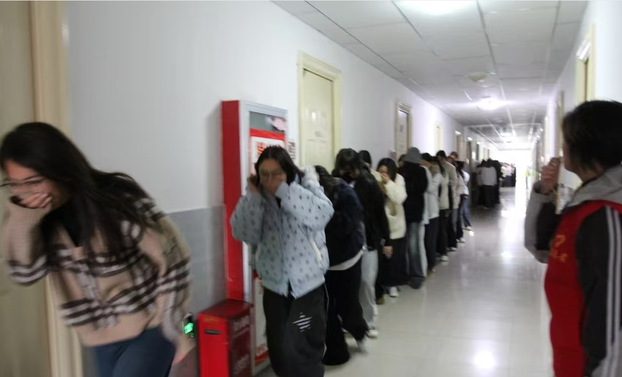 在安全员的引导下,学生们迅速反应,按照“左手扶右肩、湿毛巾捂口鼻、弯腰靠右侧”的规范动作,以一路纵队有序撤离宿舍。不同楼层学生严格遵循预定路线,避免了疏散交叉拥堵。撤离过程中,学生们保持50至100厘米的安全间隔,无推搡、打闹现象,充分展现了良好的秩序意识。