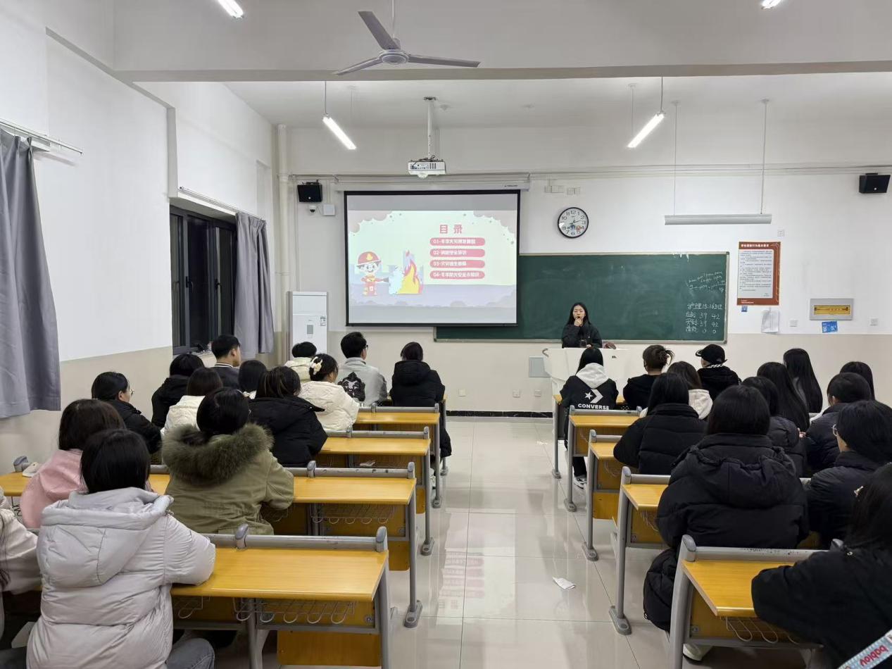 随后,辅导员围绕“消防四个能力”“四懂四会” 核心要求,用通俗易懂的语言拆解消防安全知识。从如何识别过期灭火器、正确使用消火栓,到火灾发生时如何快速找到疏散通道、用湿毛巾捂住口鼻低姿逃生,每一个细节都讲解得清晰透彻。同时,结合校园安全管理规定,明确强调禁止使用电热毯、电炉等违规电器,严禁在宿舍堆放纸箱、塑料袋等易燃物品,引导同学们从源头杜绝火灾隐患。