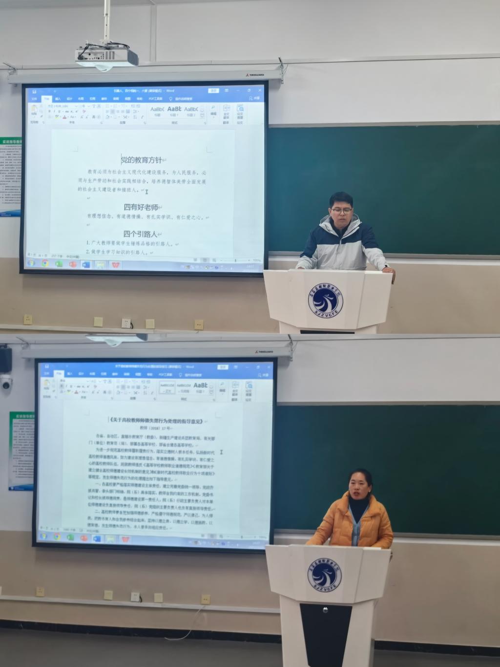 首先,张宁院长带领大家深入学习贯彻习近平总书记师德师风的重要论述精神活动和强化教师“四史”学习教育活动;还学习了《教师法》、《新时代教师职业行为准则》等内容;最后,郝艳在书记带领大家学习《关于高校教师师德失范行为处理的指导看法》《新时代高校教师职业行为十项准则》《高等学校教师职业道德规范》等内容,并以高校师德失范典型案例为警示,开展警示教育,引导教师以案明纪、警钟长鸣。