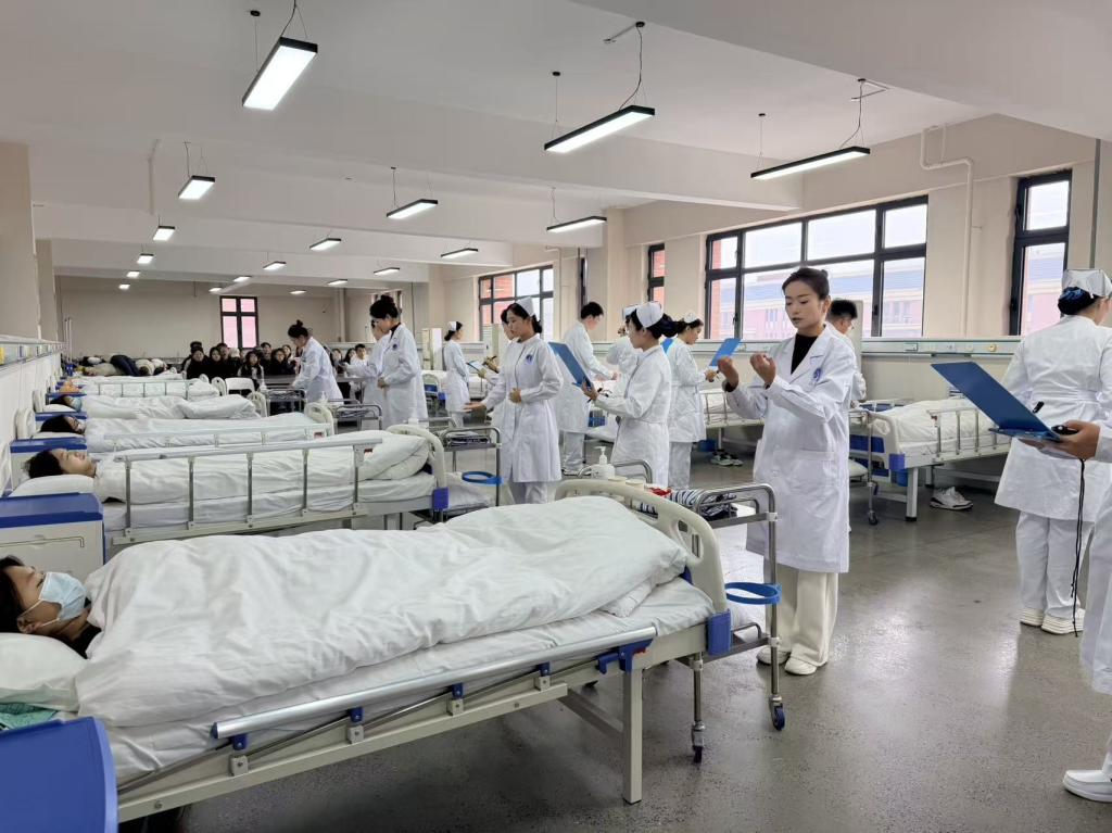 本次大赛参赛成员为2024、2025级护理和智慧健康养老服务与管理专业学生,选出决赛选手24名。24名参赛选手分成3组,每组8人,实训考核内容为老年人进行肌力评估,床上翻身叩背排痰及协助患者更衣,比赛通过仪容仪表、操作流程、人文关怀、动作细节等方面全面考核选手。