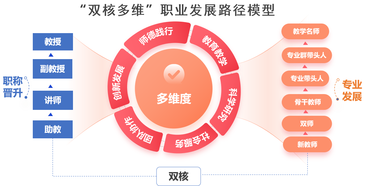 团队核心成员20人均为国家第二批现代学徒制试点院校骨干成员,其中高级职称80%,硕士研究生90%,“双师型”教师90%,成员中河北省“三三三人才工程”第三层次人选1人、“河北省优秀教师”2人、“河北省优秀教育工作者”1人、“河北省师德标兵”2人、“河北省职业教育德育工作骨干管理人员1人”,荣获省部级荣誉称号18项。团队实施高水平“双带头人”培养、高素质骨干教师成长、高起点“双师型”教师培养计划,助推教师“职业化、团队化、专业化”,构建了“双核多维”教师职业发展路径模型,形成了“三位一体”双师培训培养体系,打造高水平结构化有影响力的教师创新团队。