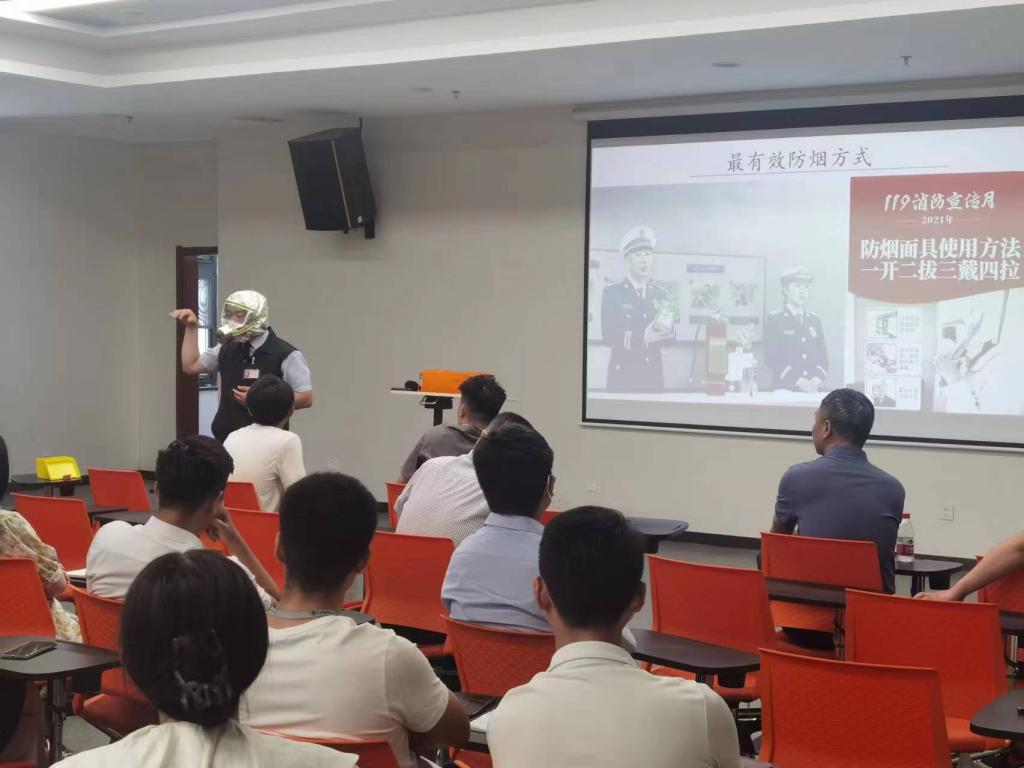 田教员特别强调了发生火灾的紧急情况下常用的自救和逃生方法,介绍了灭火器、灭火毯、灭火弹、防烟面具等器材使用方法,强调了在什么情况下使用什么样的灭火器材和灭火方法,如燃气起火应先灭火后关阀门。
