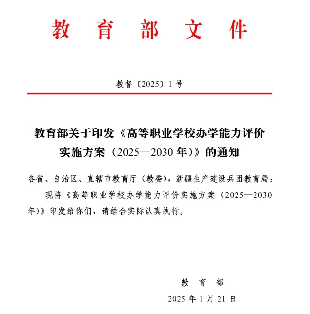 2025年1月,教育部印发《高等职业学校办学能力评价实施方案(2025—2030年)》(以下简称《实施方案》),为高职院校的办学能力评价提供了系统框架。《实施方案》要求各地根据国家框架、结合地方实际,制定高职院校教学工作评估指标体系及实施方案,力争到2030年完成全覆盖评估工作。实施方案内容如下:
