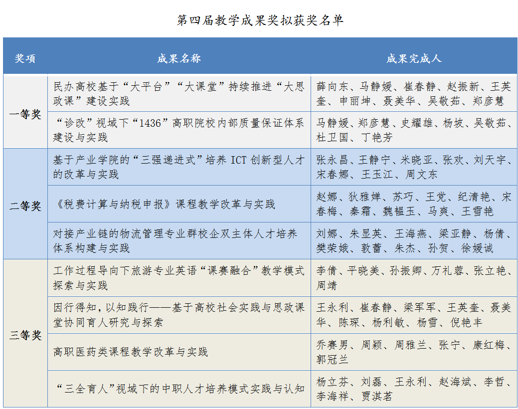 根据学校《教学成果奖评选与管理办法》的相关规定,学校组织开展了第四届教学成果奖评审工作。经过形式审查、集中评审等环节,共评选出第四届教学成果奖一等奖2项,二等奖3项,三等奖4项。现将评选结果予以公示。
