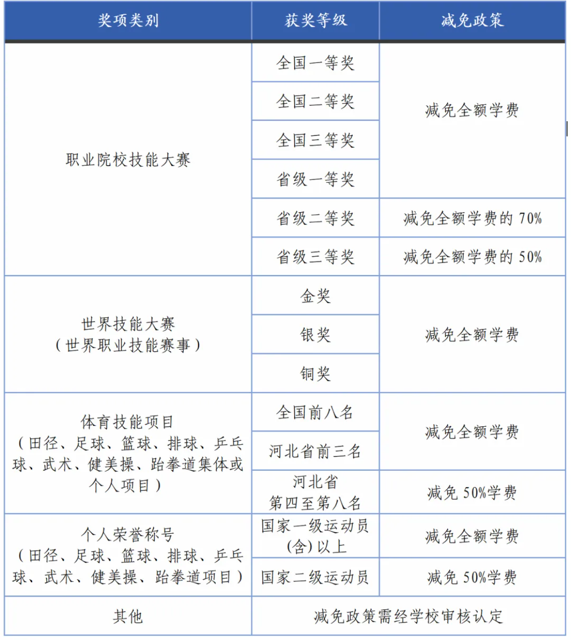学校根据学生取得奖项类别、获奖等级,分别执行相应的学费减免政策,具体如下表所示:
