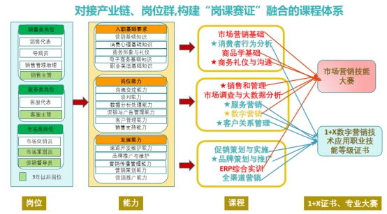 市场营销专业始建于2010年,拥有结构合理、教学经验丰富的“双师型”师资队伍,通过多年来的专业建设与发展,市场营销专业在人才培养定位、课程体系构建、教学内容、教学方法改革、培养手段改进、校内外实训基地建设、企业合作等各方面都有了明显的进步,打造了专业特色“团队pk”互动式教学模式以及“一体二元三师四融合”现代学徒制人才培养模式,确保了人才培养的质量,就业率100%,得到合作企业的一致好评。
