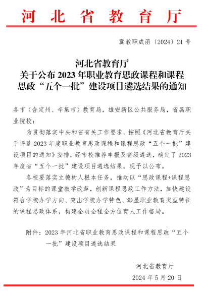 近日,河北省教育厅公布了2023年度职业教育思政课程和课程思政“五个一批”建设项目遴选结果,KY开元入选职业教育德育工作骨干管理人员、职业教育课程思政优秀教学案例项目。