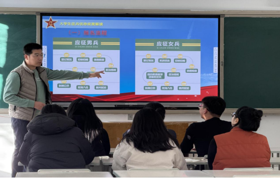 随后,学院征兵联络员老师围绕2025年冬季征兵政策展开详细解读,从报名条件、体检政考流程、学费补偿政策,到退役后专升本优待、职业发展支持等学生关心的问题逐一解答,为学生绘制了清晰的“参军路线图”。退役复学学生代表分享了自己的军旅蜕变故事,他讲述了从校园学子到部队战士的成长历程,以及退役后借助政策优势完成专升本的经历,真挚的分享引发了在场学生的强烈共鸣,现场掌声不断。