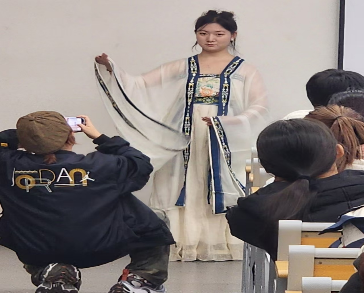 在介绍汉服形制时,主持人详细讲解了多种常见款式。比如交领右衽,这是汉服的典型特征,体现了传统文化内涵。还有衣裳制、深衣制等,其中曲裾深衣的优美线条、直裾的简约干练,让在场同学们赞叹不已。襦裙更是备受关注,齐胸襦裙尽显女子的灵动与娇俏,仿佛能看到大唐盛世的繁荣;齐腰襦裙则展现出温婉气质。