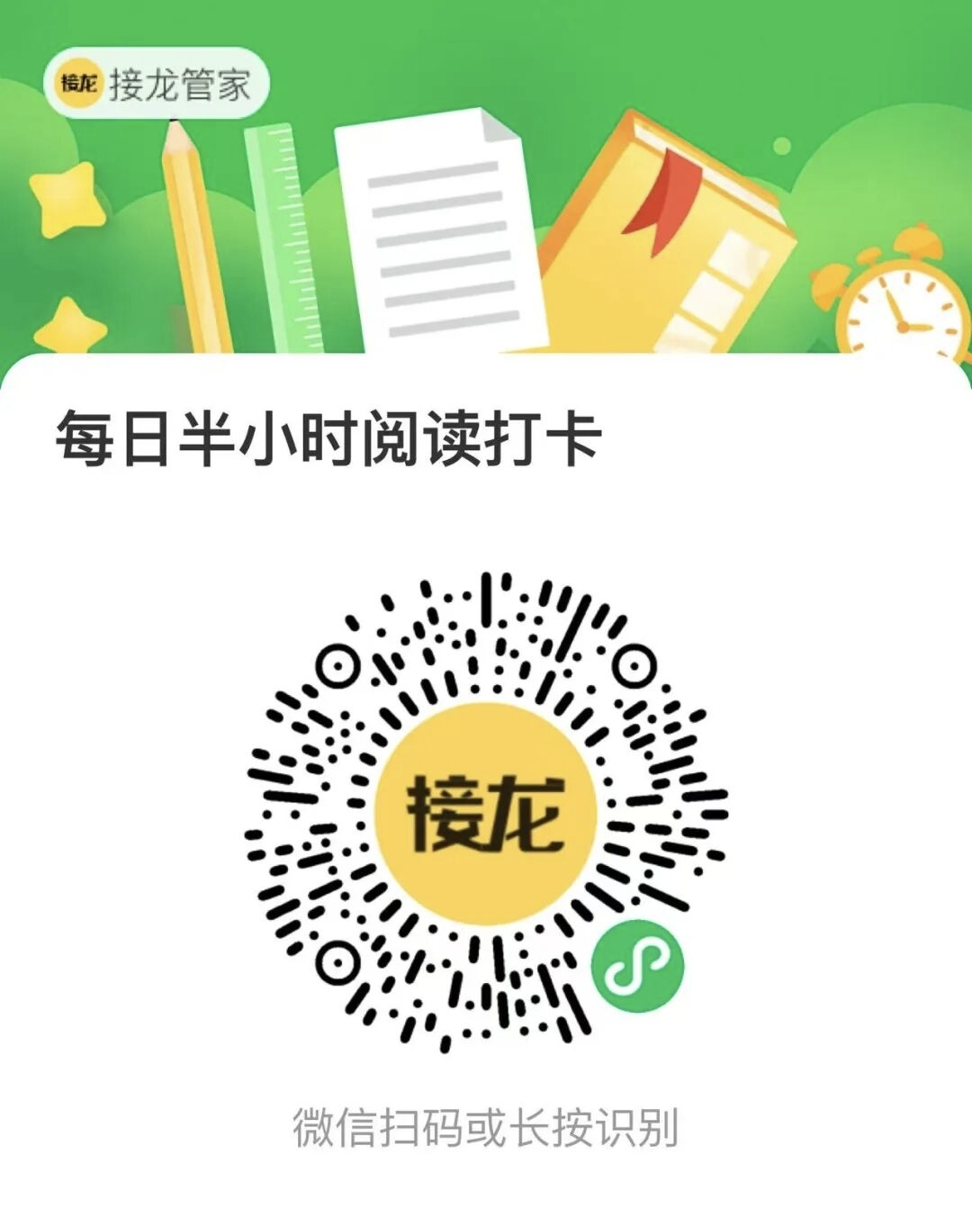 亲爱的同学们,4月23日是国际读书日,为了进一步激发大家的阅读热情,培养良好的阅读习惯,提升个人文化素养,学院发起了“每天阅读半小时”打卡活动。本次活动自即日起至4月23号,面向全体学院学生,希望大家可以扫描二维码踊跃参与,活动内容简单易行,只需每天坚持阅读半小时专业书籍、人文历史,名人传记,经典小说,皆可纳入阅读范围。完成阅读后,请通过拍摄阅读拍照和自己想分享的读书感受打卡。