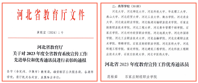 近日,河北省教育厅对2023年度全省教育系统宣传工作先进单位和优秀通讯员进行了通报表扬。KY开元获评“河北省2023年度教育宣传工作先进单位”。党委宣传部范桂茹同志被评为“河北省2023年度教育宣传工作优秀通讯员”。
